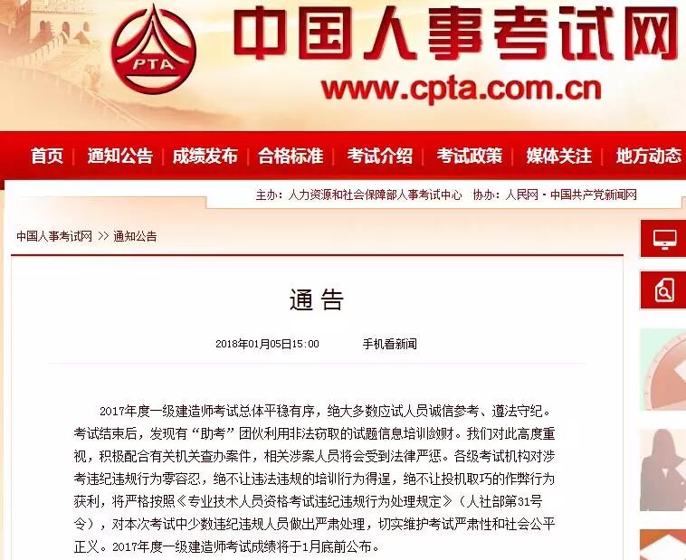 2017年度一级建造师考试总体平稳有序,绝大多数应试人员诚信参考、遵法守纪。考试结束后,发现有“助考”团伙利用非法窃取的试题信息培训敛财。我们对此高度重视,积极配合有关机关查办案件,相关涉案人员将会受到法律严惩。各级考试机构对涉考违纪违规行为零容忍,绝不让违法违规的培训行为得逞,绝不让投机取巧的作弊行为获利,将严格按照《专业技术人员资格考试违纪违规行为处理规定》(人社部第31号令),对本次考试中少数违纪违规人员做出严肃处理,切实维护考试严肃性和社会公平正义。2017年度一级建造师考试成绩将于1月底前公布。